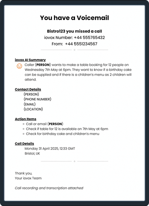 The iovox system can handle many outcome-based customisations such as giving callers the option of booking at a nearby restaurant if the primary location is at capacity, or routing large bookings to a live person or custom voicemail for summarization and follow up. These customisations are defined as part of the onboarding process.