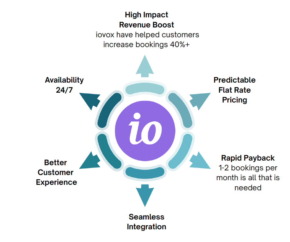 iovox transforms business communications with powerful results: 40%+ booking increases, 24/7 availability, flat-rate pricing, and quick ROI after just 1-2 bookings monthly. Seamless integration and enhanced customer experiences complete this comprehensive solution, delivering significant revenue growth with minimal implementation effort.