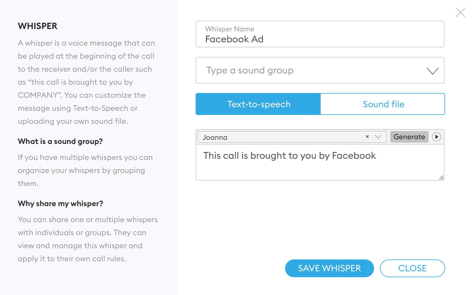 An iovox Call Whisper is a pre-recorded message that can be played to the called party anytime an iovox Number or iovox WebConnect call is initiated. Ideal for any company, but especially useful for online directories, classifieds, or marketplaces.