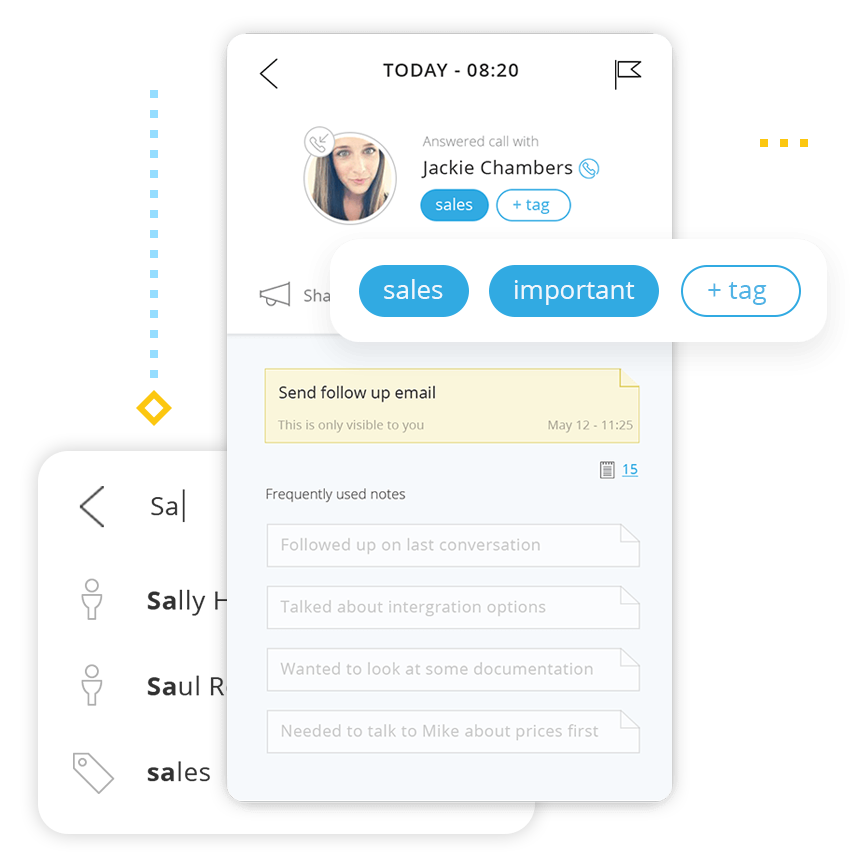 Combined with notes, tags let you keep a searchable history of the conversation.
