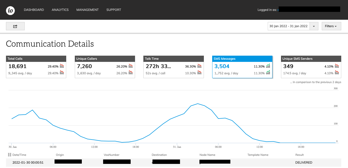 - Select "SMS messages" or "Unique SMS senders" KPI box, the graph and the table (which by default displays the calls) will display the details of the SMSs