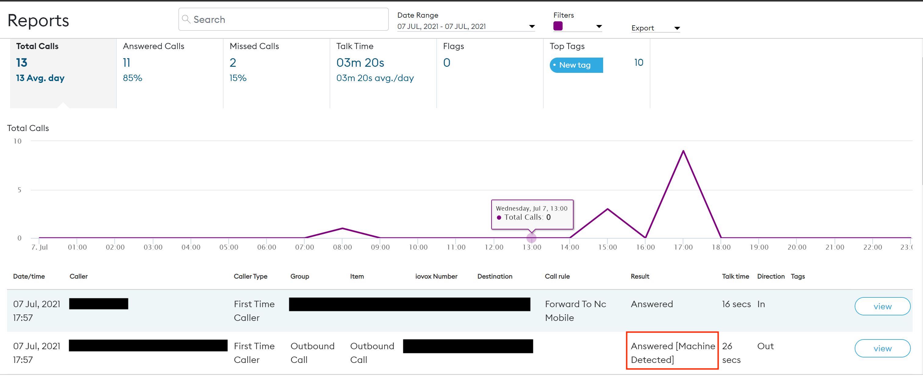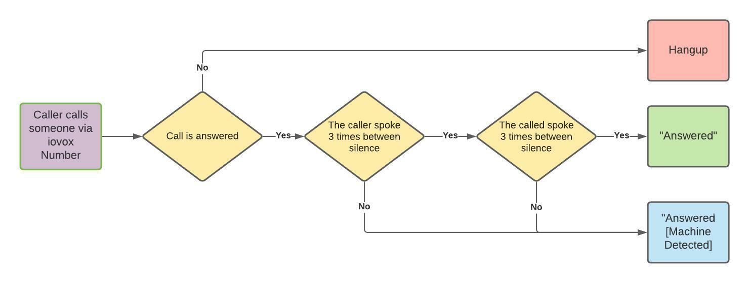 Whether the call is answered by someone or by a machine, iovox will get the same network response, and by default, will consider and display it as "Answered".